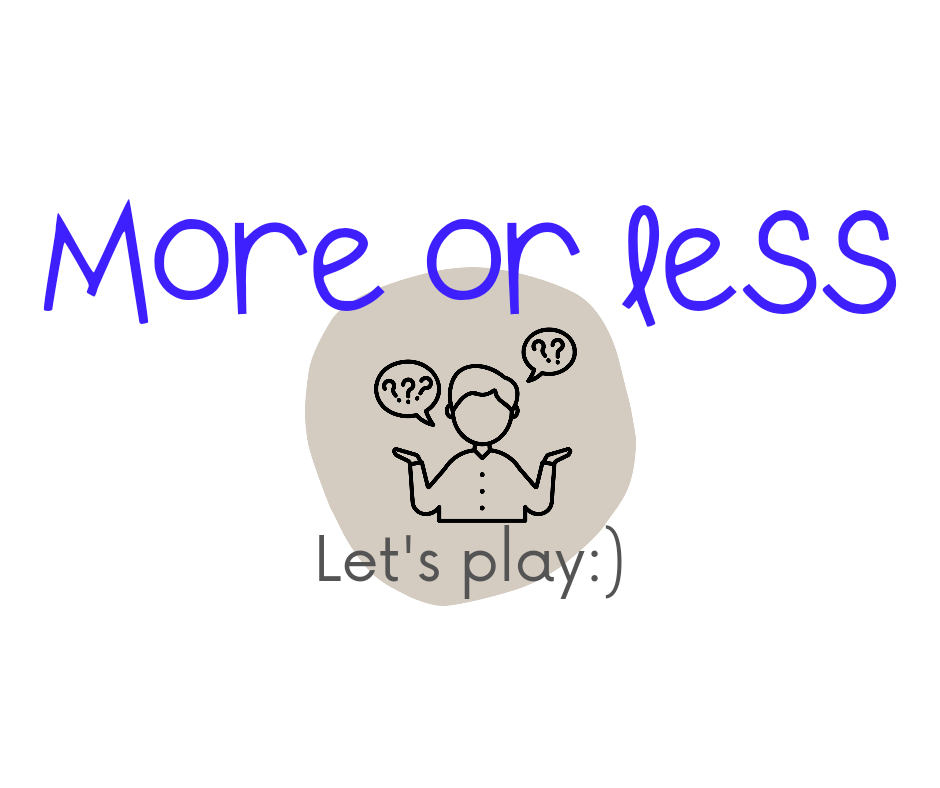 - każdy z uczestników kolejno podaje swoją propozycję liczby próbując odgadnąć ukrytą liczbę, kierując się wskazówkami którymi są słowa MORE oraz LESS np. jeśli szukaną liczbą jest 10, a uczestnik zabawy zaproponuje 7 to zadaniem osoby prowadzącej jest zareagować odpowiednim słowem, w tym przypadku będzie to słowo MORE, jeśli któryś z uczestników zaproponuje liczbę 11, to osoba prowadząca użyje słowa LESS, gramy do momentu aż jeden z uczestników zabawy odgadnie właściwą liczbę.
