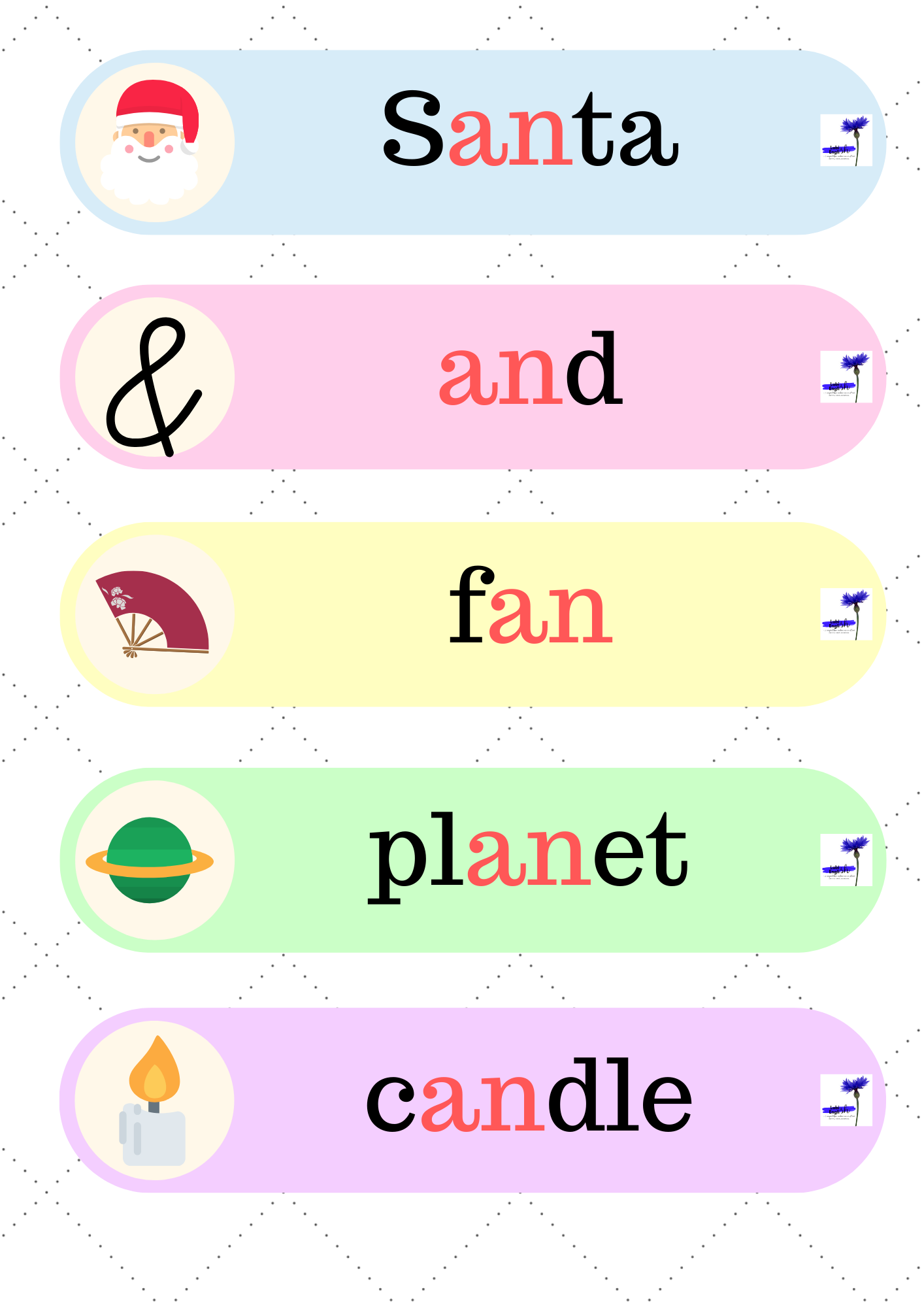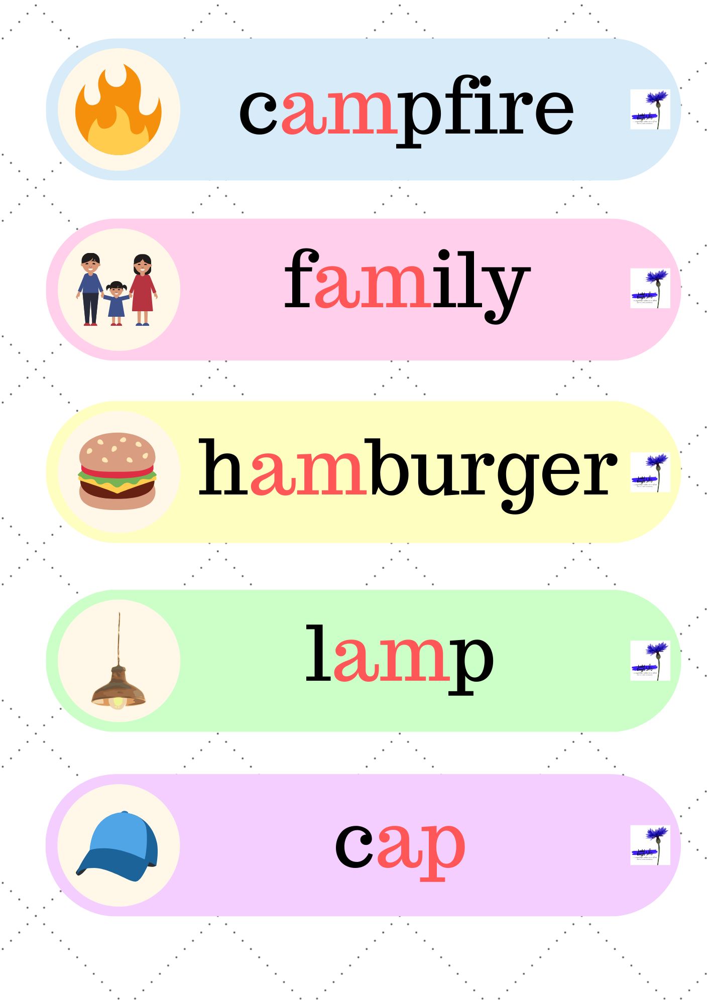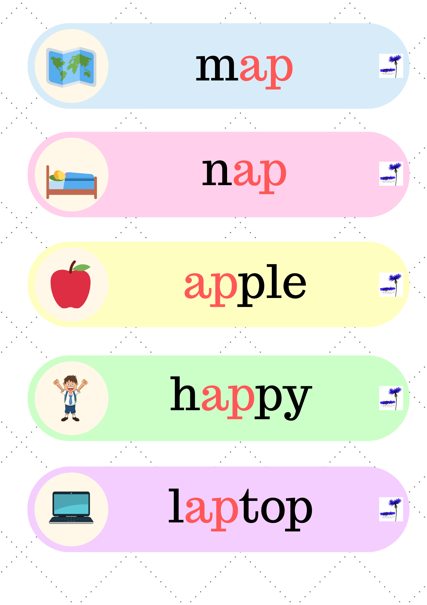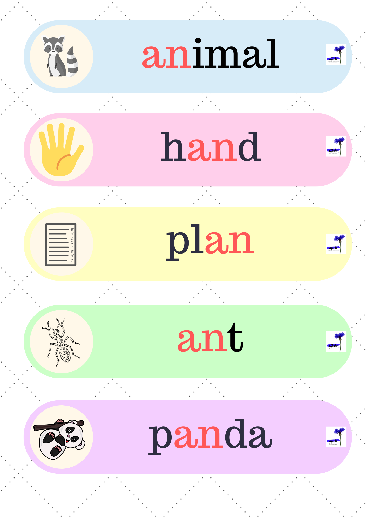 6. Flower Bingo – 51 stron z grą, dzięki której utrwalimy czytanie i wymowę krótkiego dźwięku a /æ/, a także zapis fonetyczny i umiejętność odczytywania go.