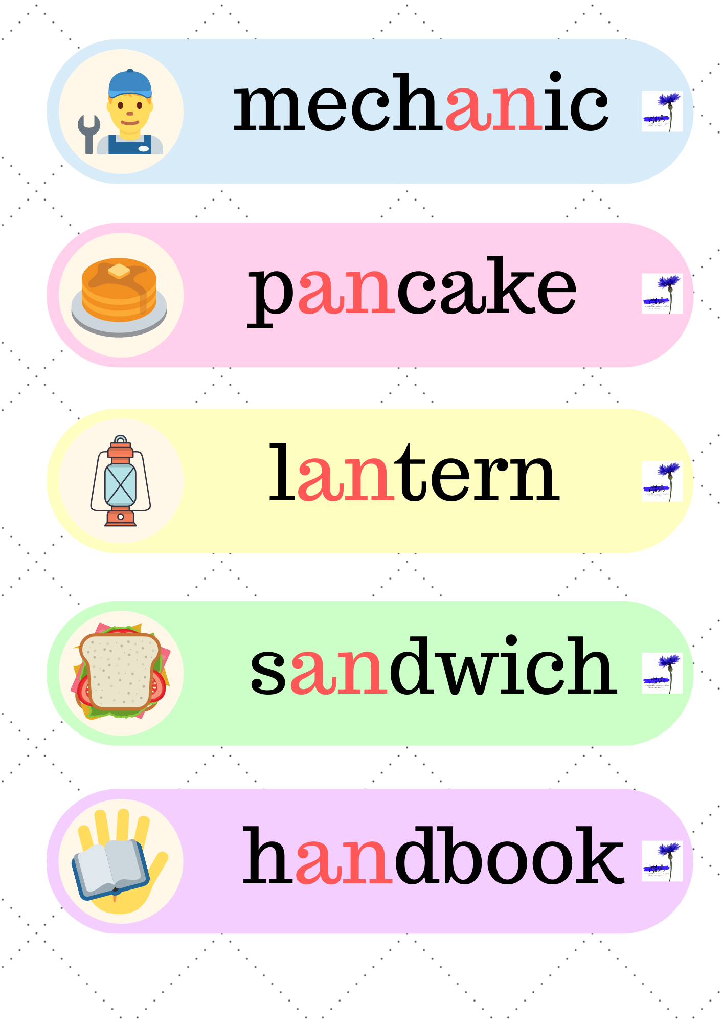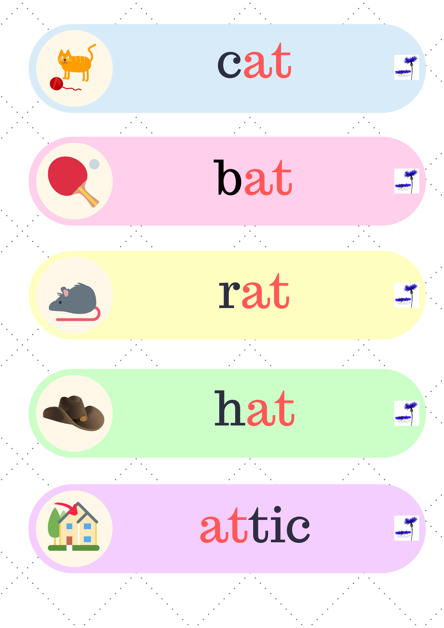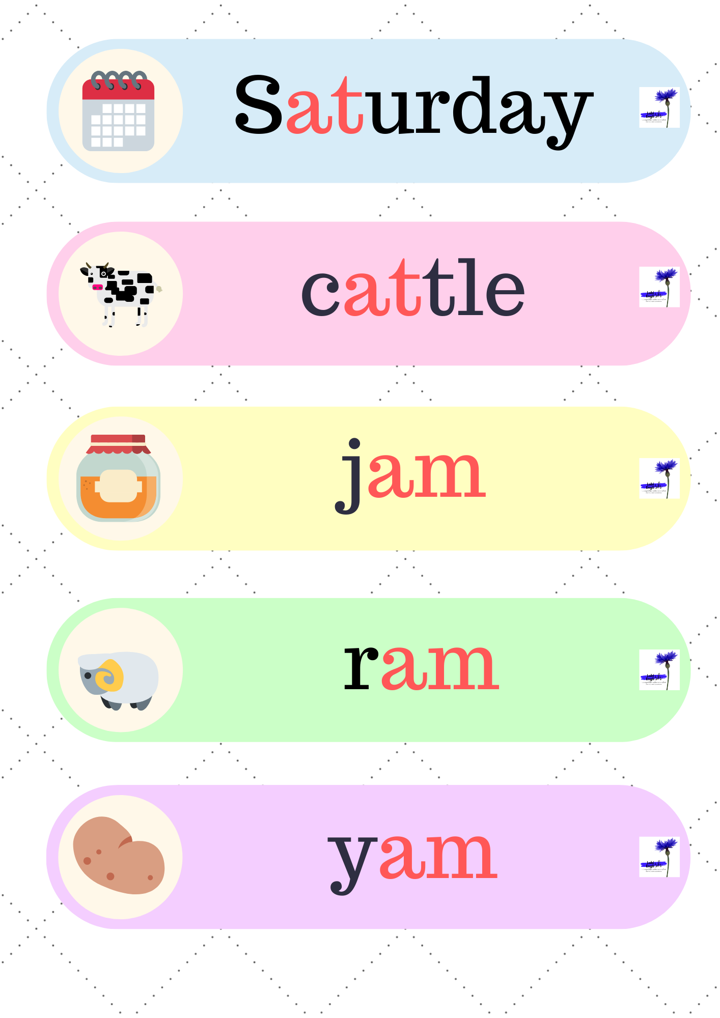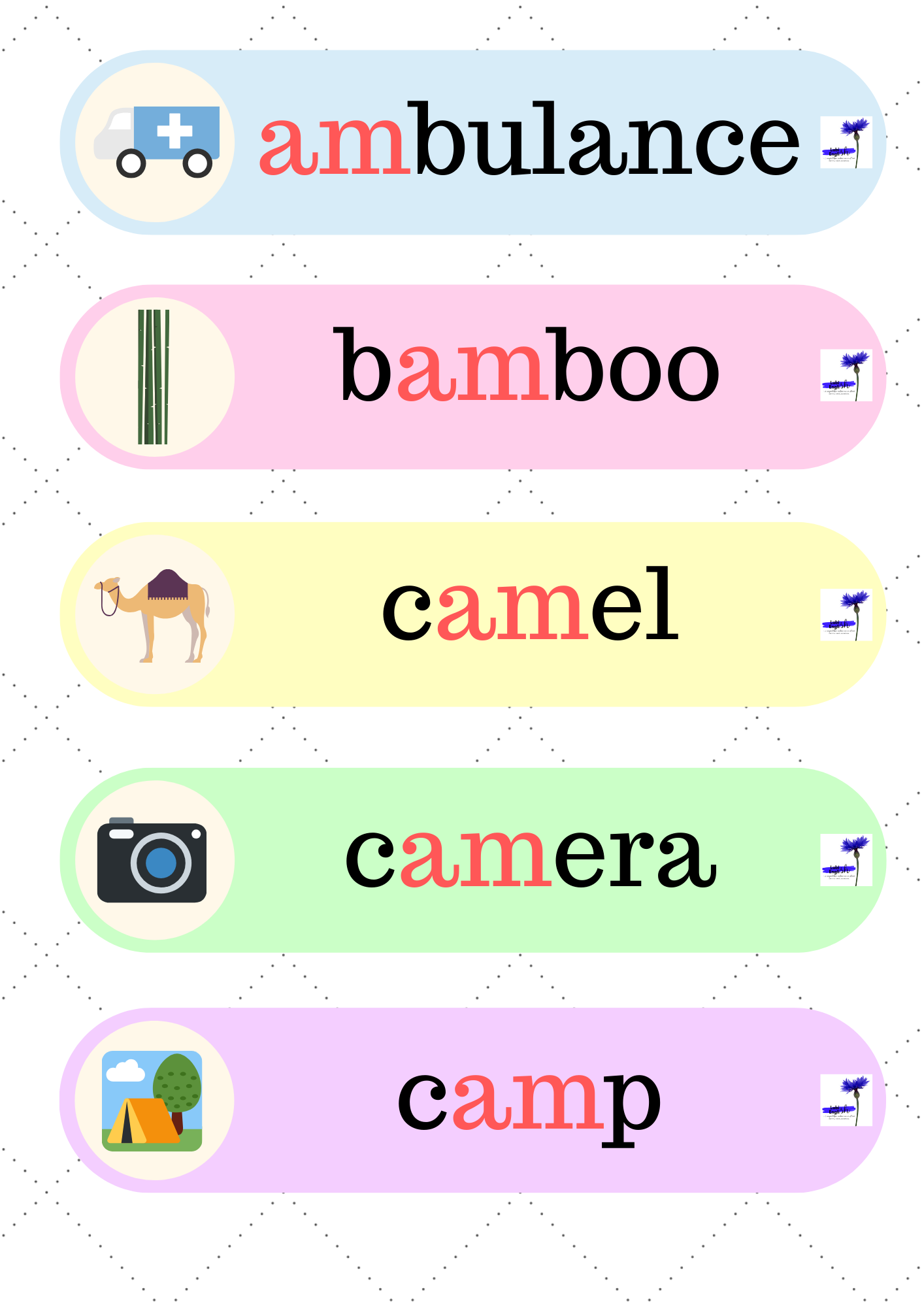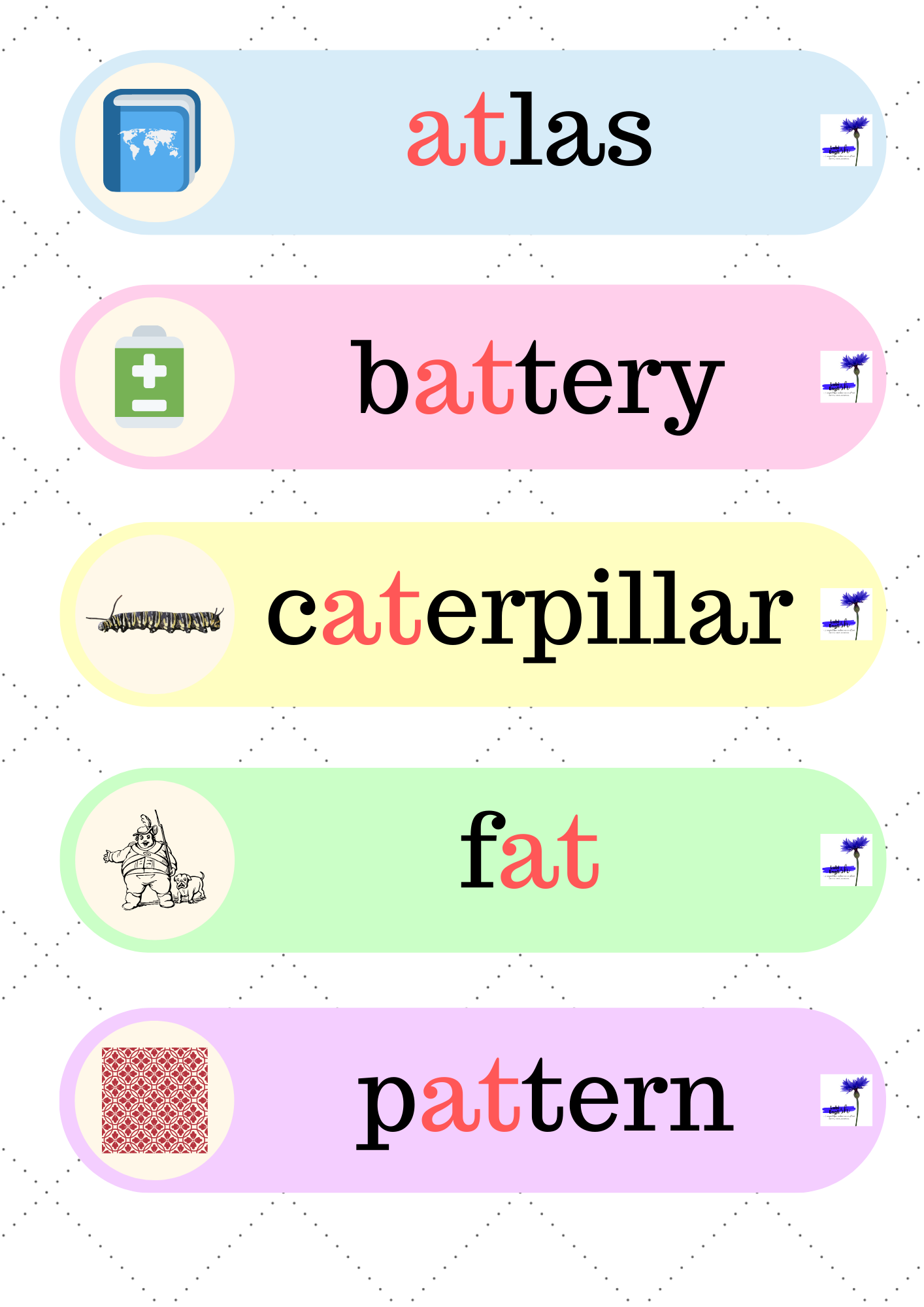 6. Flower Bingo – 51 stron z grą, dzięki której utrwalimy czytanie i wymowę krótkiego dźwięku a /æ/, a także zapis fonetyczny i umiejętność odczytywania go.