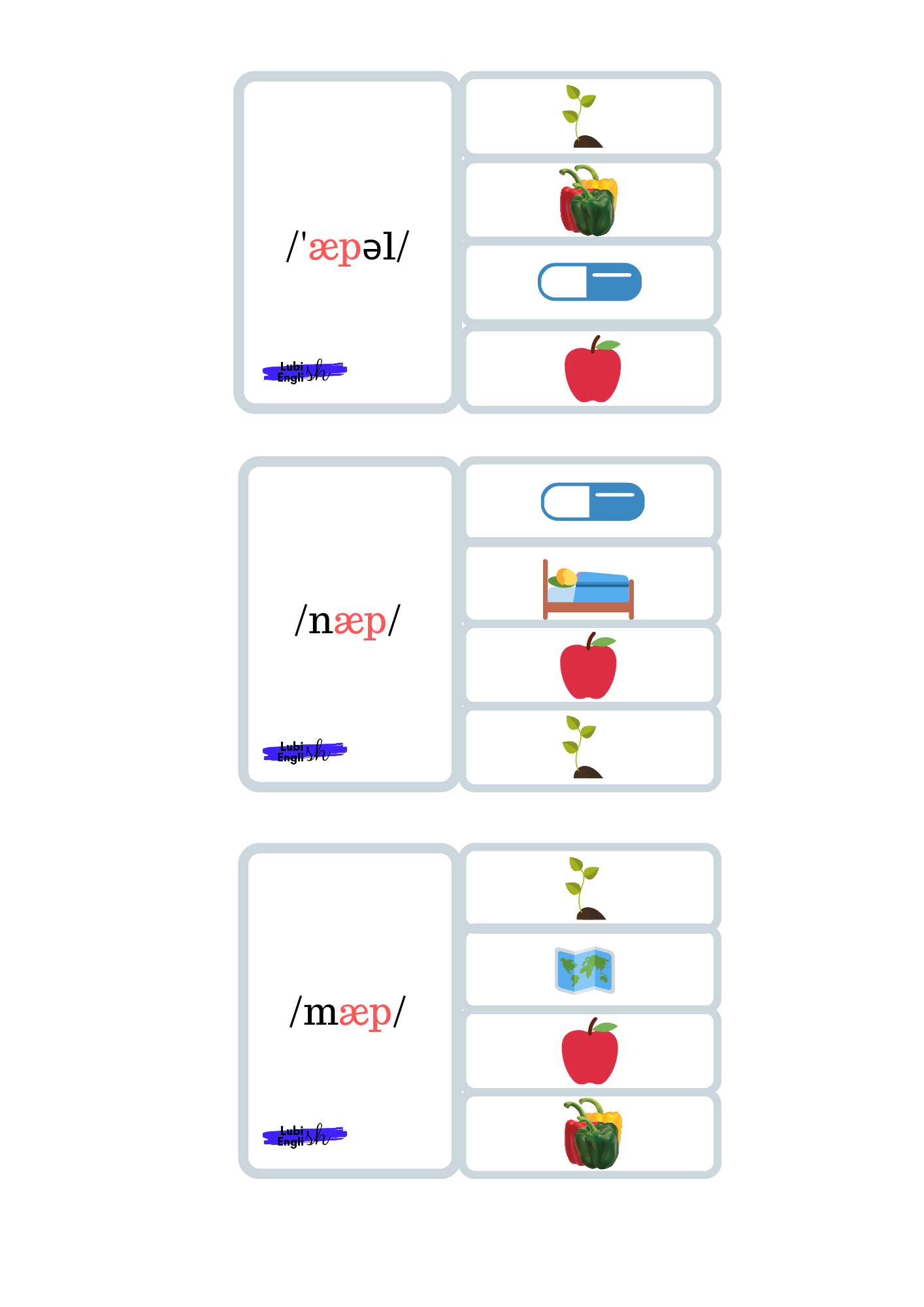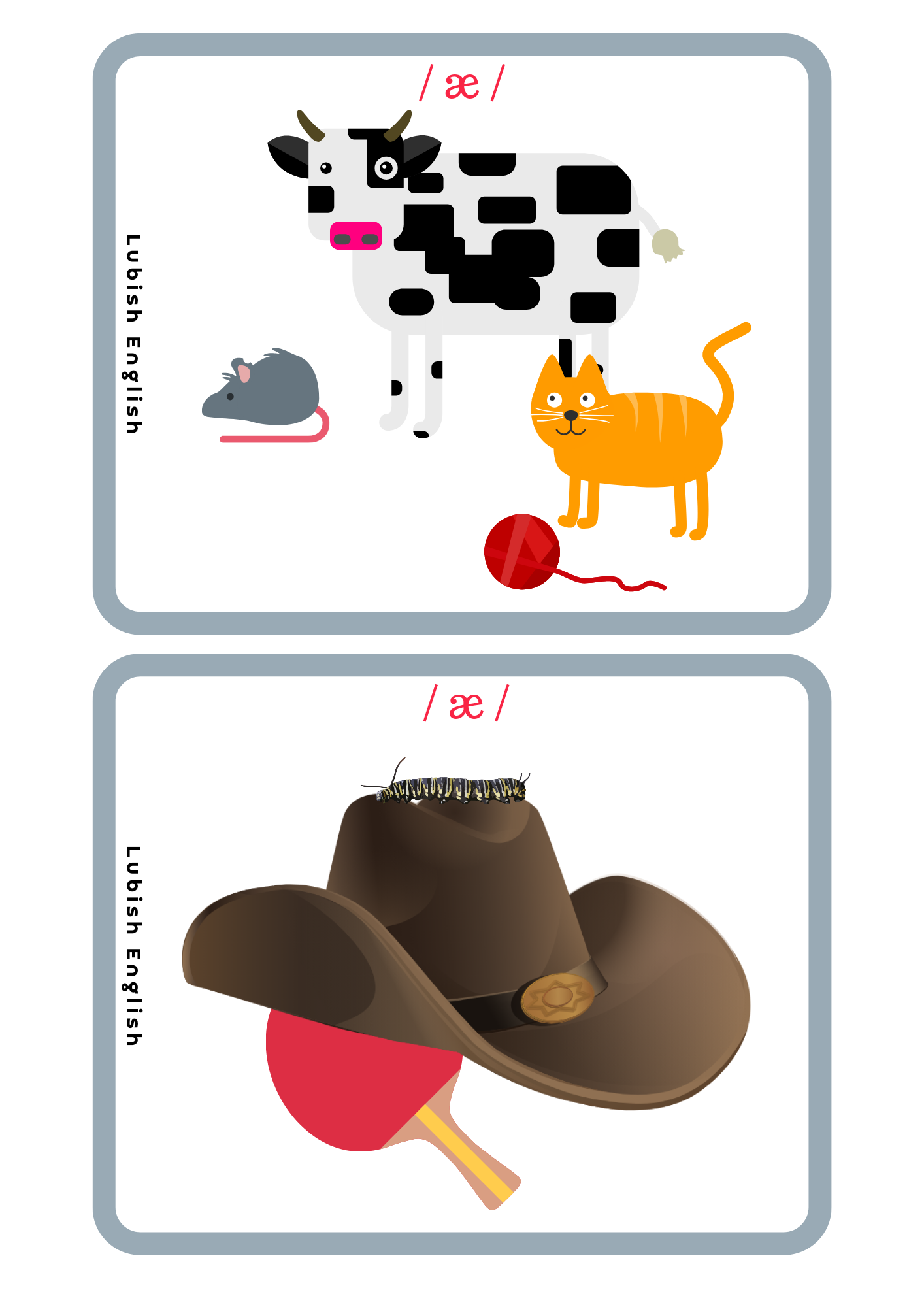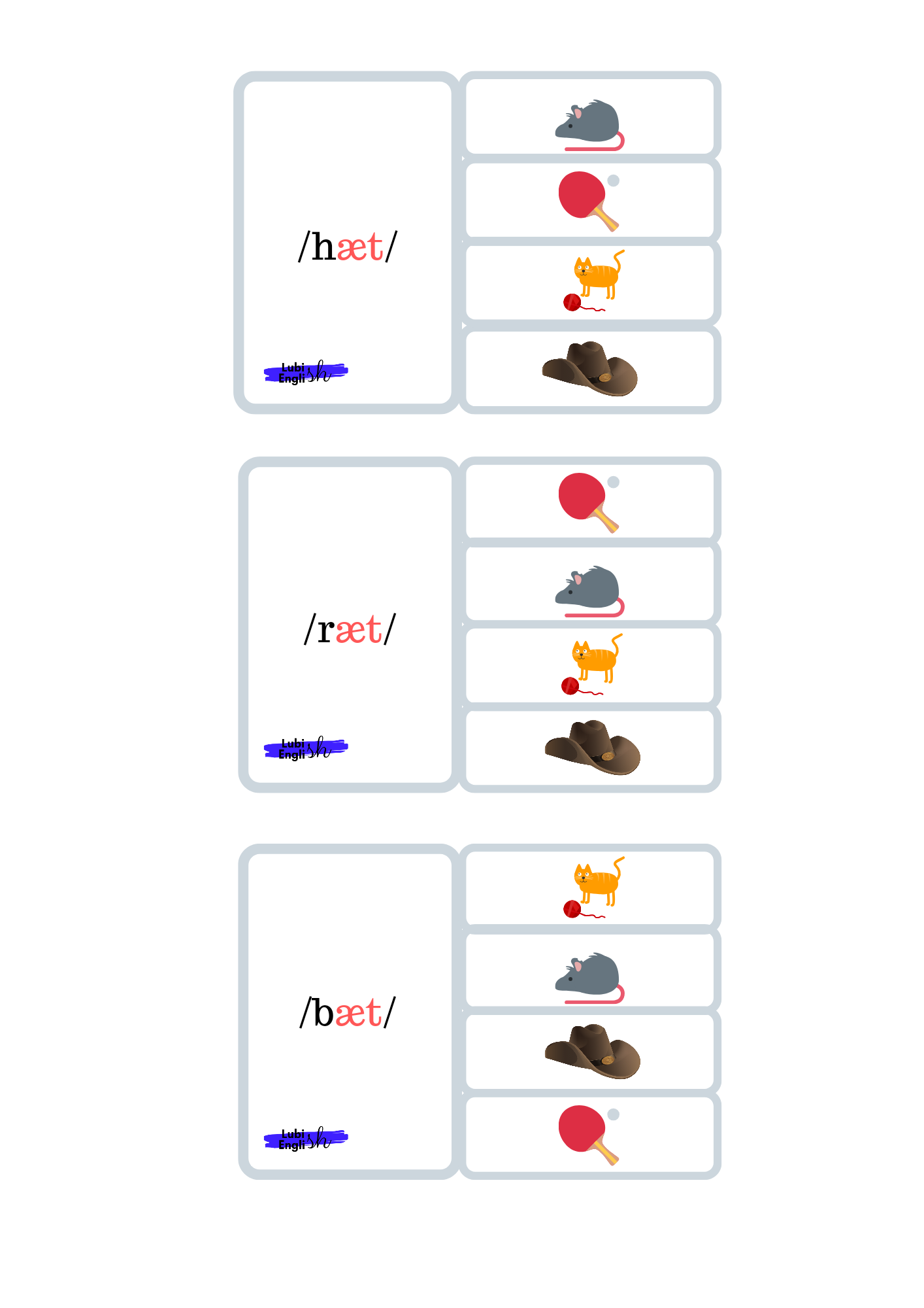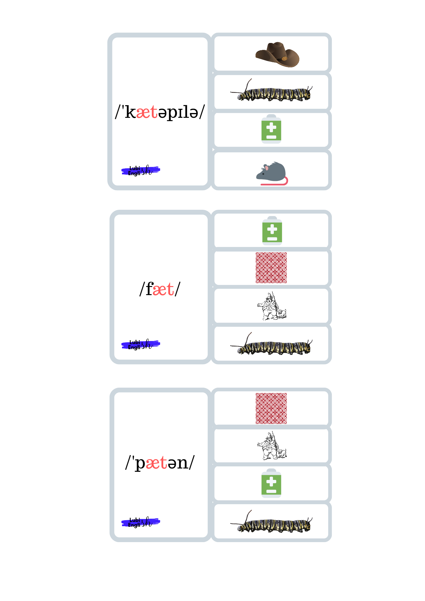 - Memory game – W tej grze doskonalimy wymowę krótkiego a /æ/. Gra polega na dobraniu trzech elementów, (a nie dwóch, jak to bywa w tradycyjnym Memory Game) a mianowicie Ilustracji – wyrazu – zapisu fonetycznego.