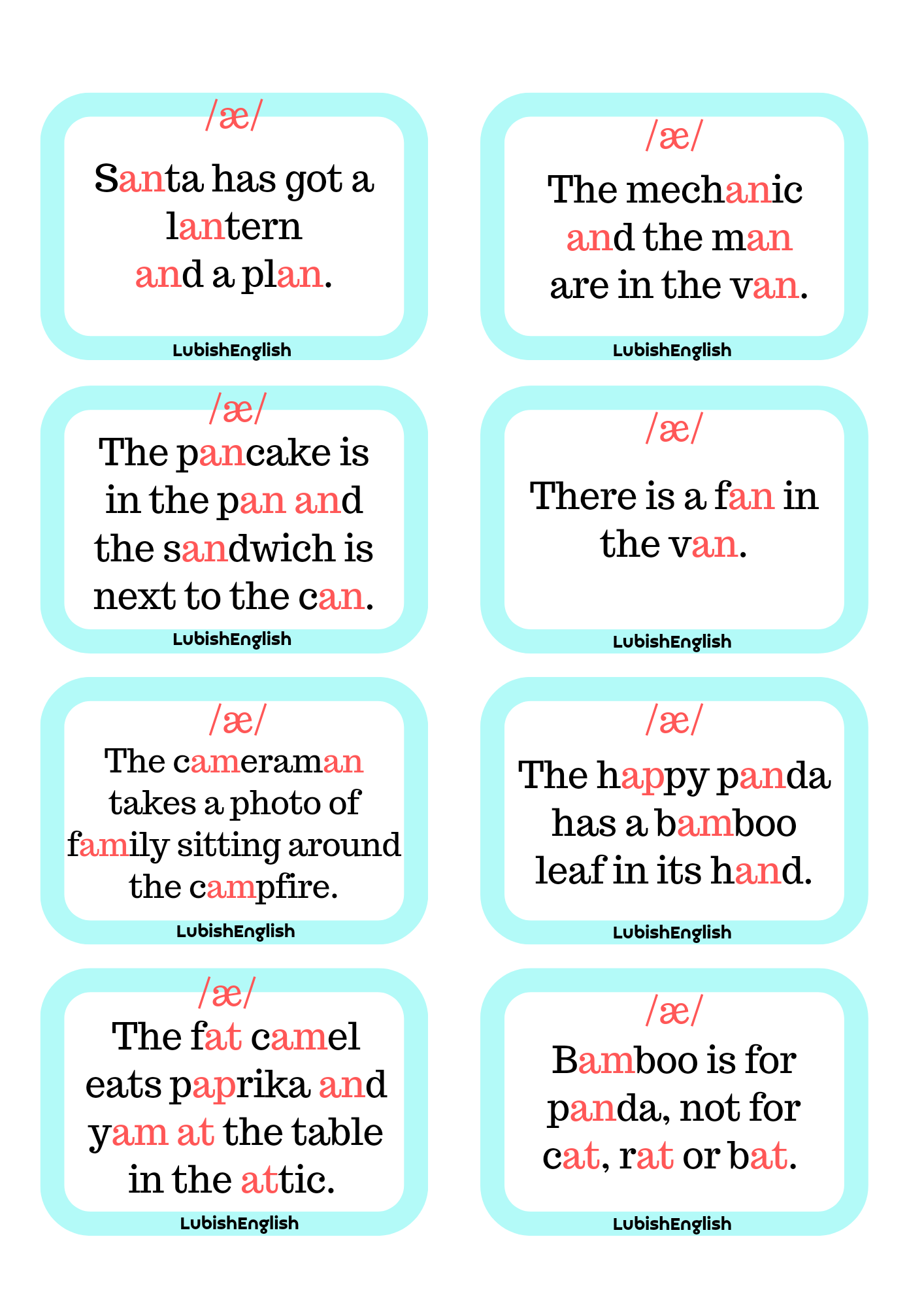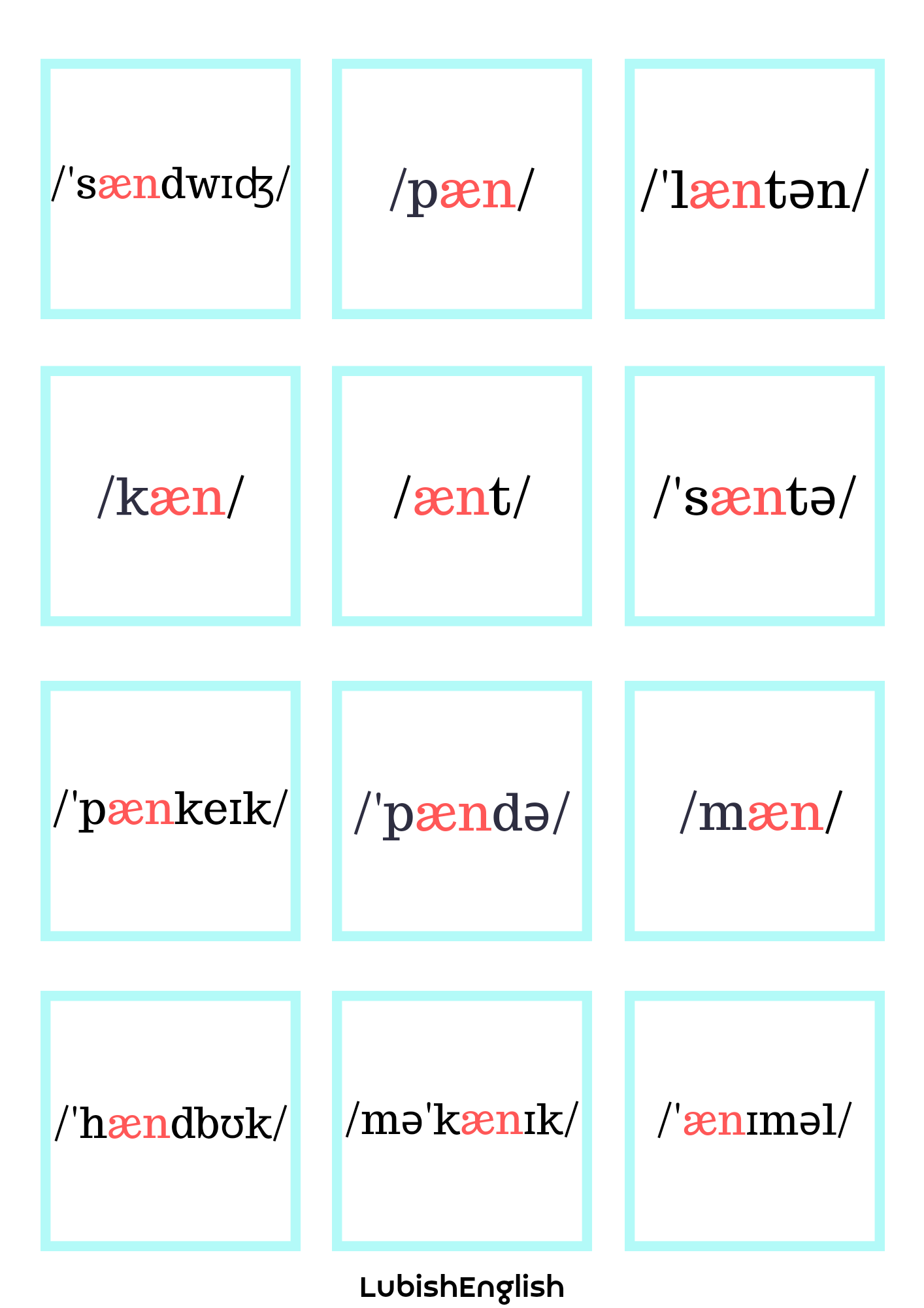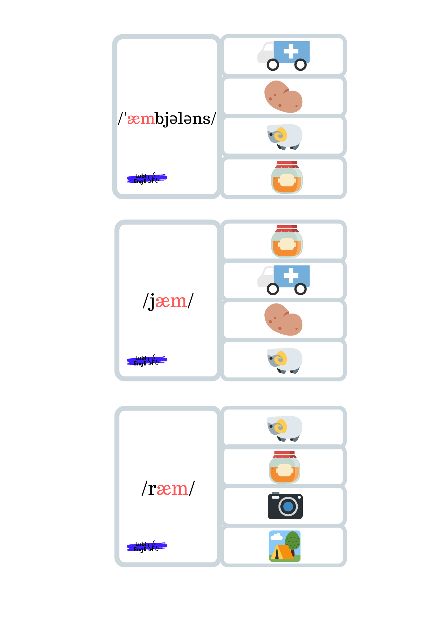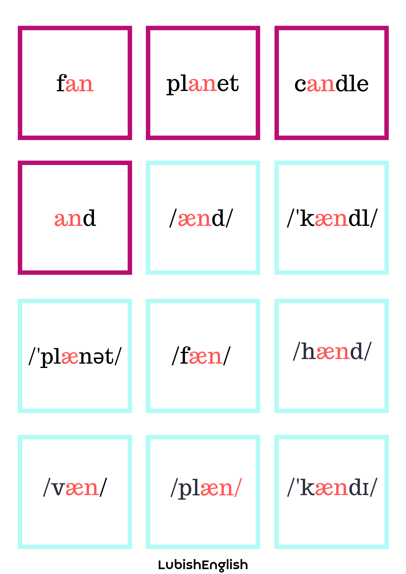 - Memory game – W tej grze doskonalimy wymowę krótkiego a /æ/. Gra polega na dobraniu trzech elementów, (a nie dwóch, jak to bywa w tradycyjnym Memory Game) a mianowicie Ilustracji – wyrazu – zapisu fonetycznego.