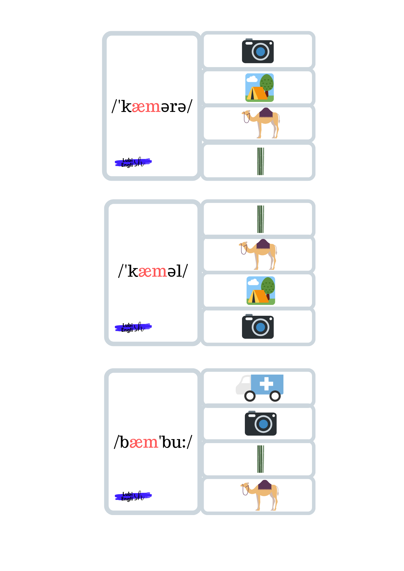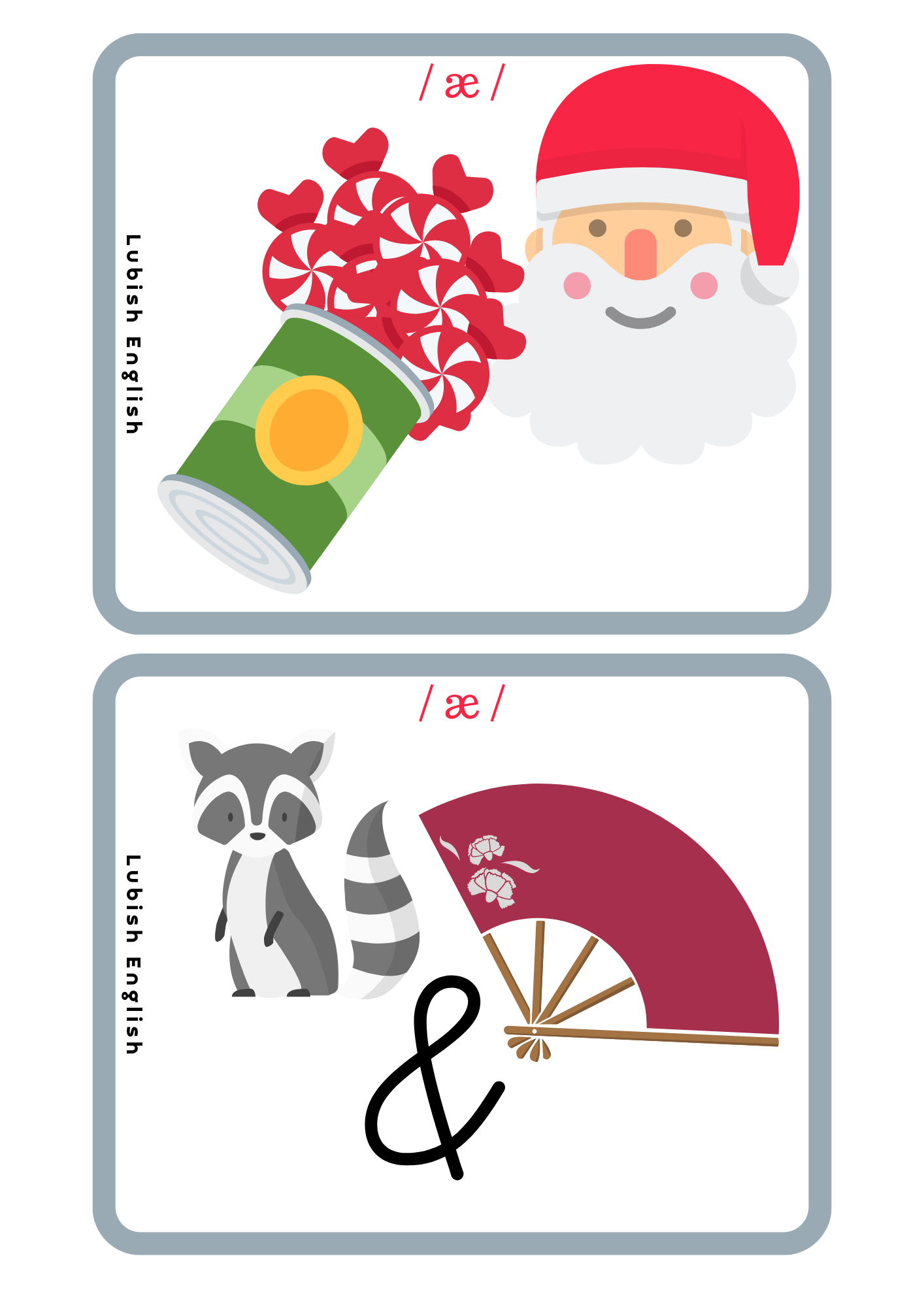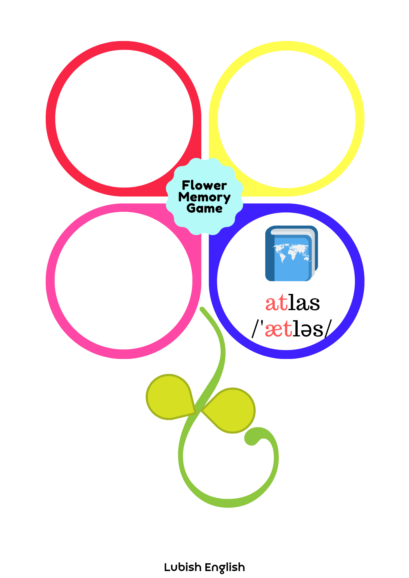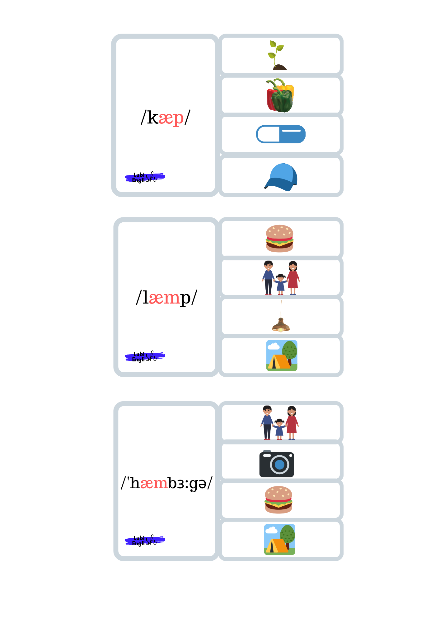 - Memory game – W tej grze doskonalimy wymowę krótkiego a /æ/. Gra polega na dobraniu trzech elementów, (a nie dwóch, jak to bywa w tradycyjnym Memory Game) a mianowicie Ilustracji – wyrazu – zapisu fonetycznego.