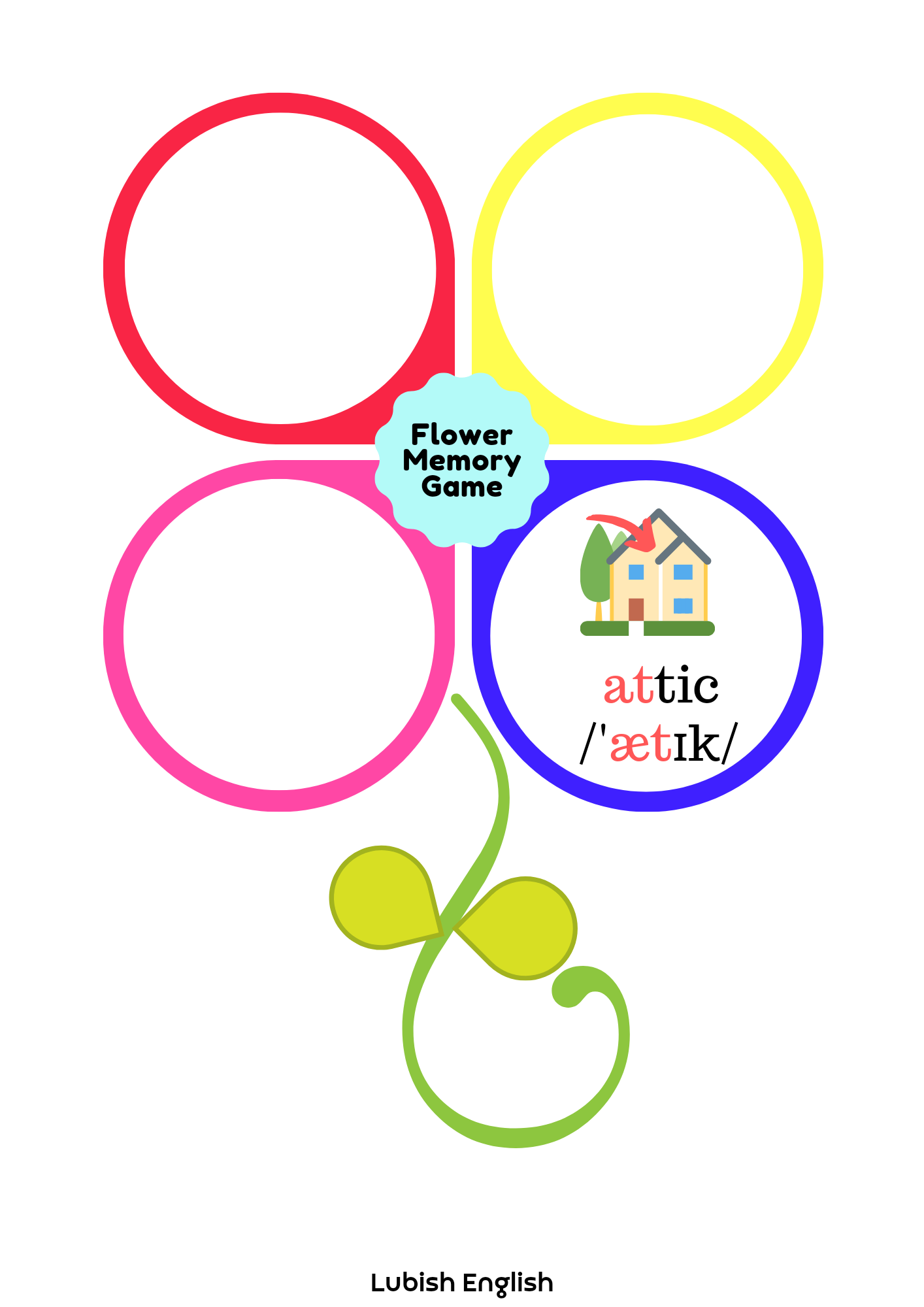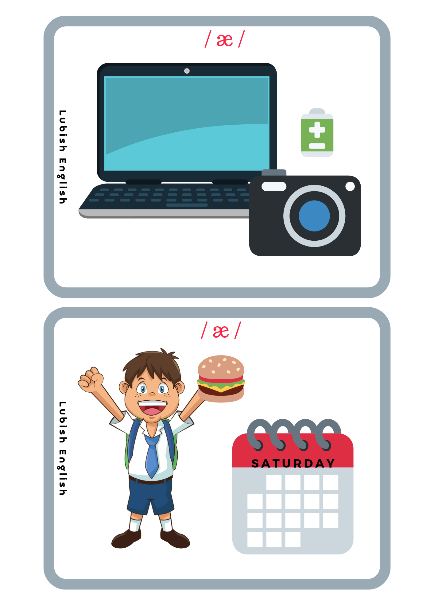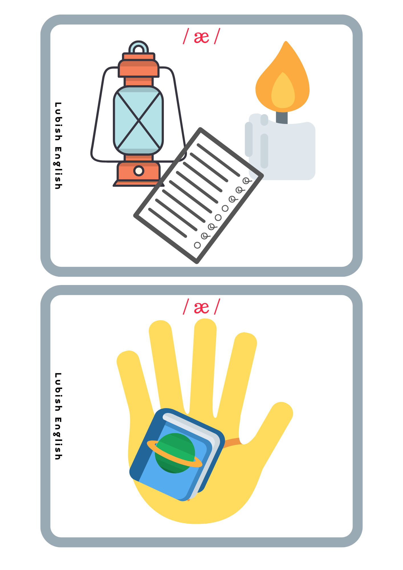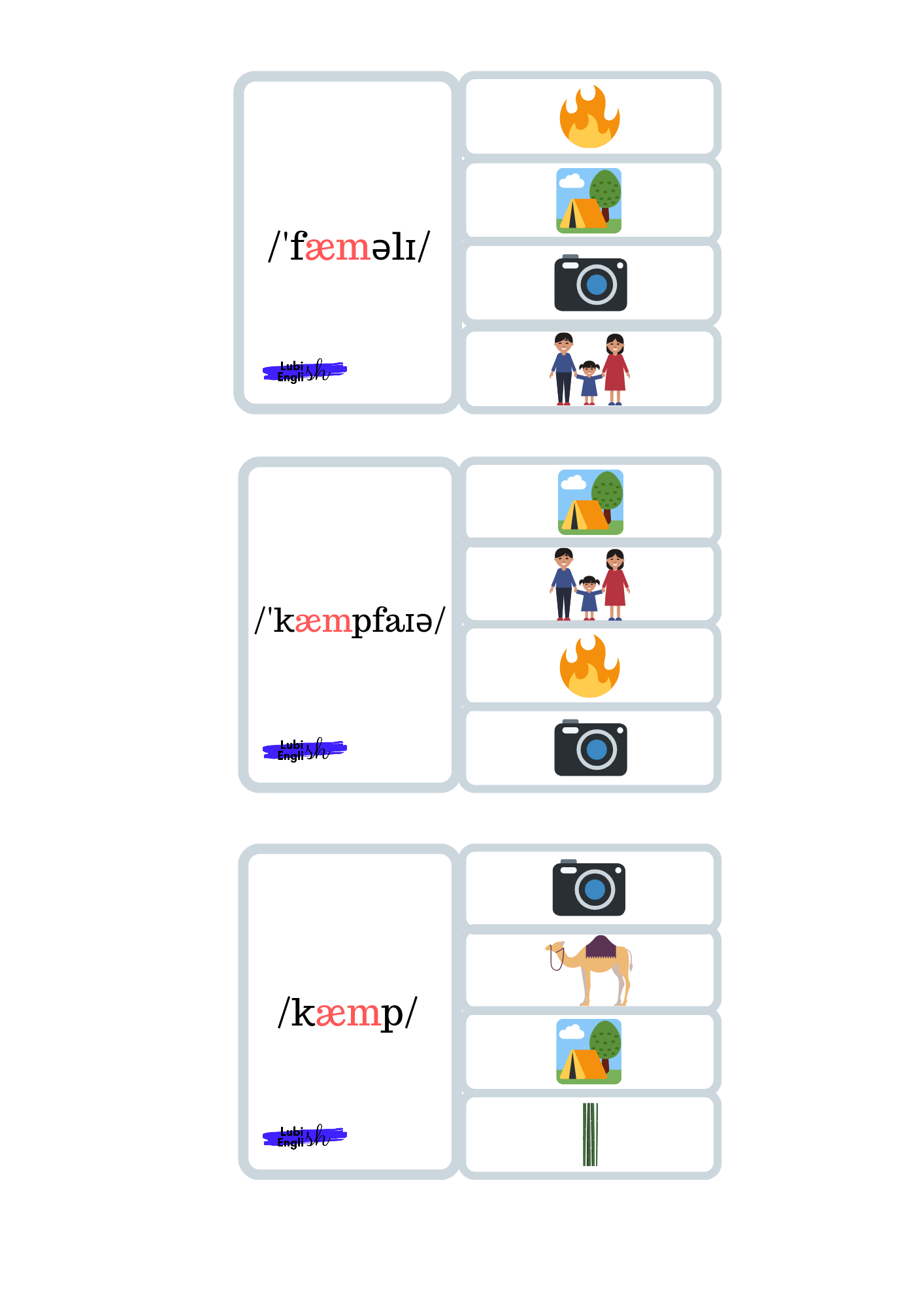 - Memory game – W tej grze doskonalimy wymowę krótkiego a /æ/. Gra polega na dobraniu trzech elementów, (a nie dwóch, jak to bywa w tradycyjnym Memory Game) a mianowicie Ilustracji – wyrazu – zapisu fonetycznego.