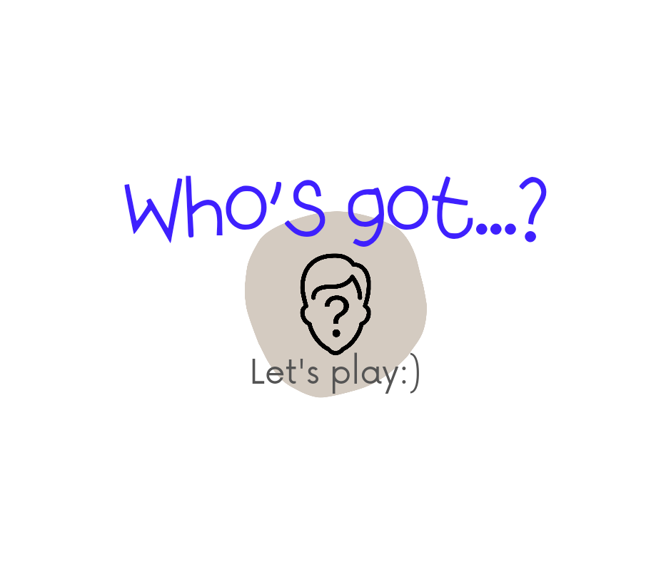 - osoba prowadząca zabawę (nauczyciel lub uczeń) ma na myśli jedną osobę spośród wszystkich uczestników zabawy; zadaje tylko połowę pytania, dotyczącego jakiegoś szczegółu związanego z wybraną przez siebie osobą np. Who’s got pink…?