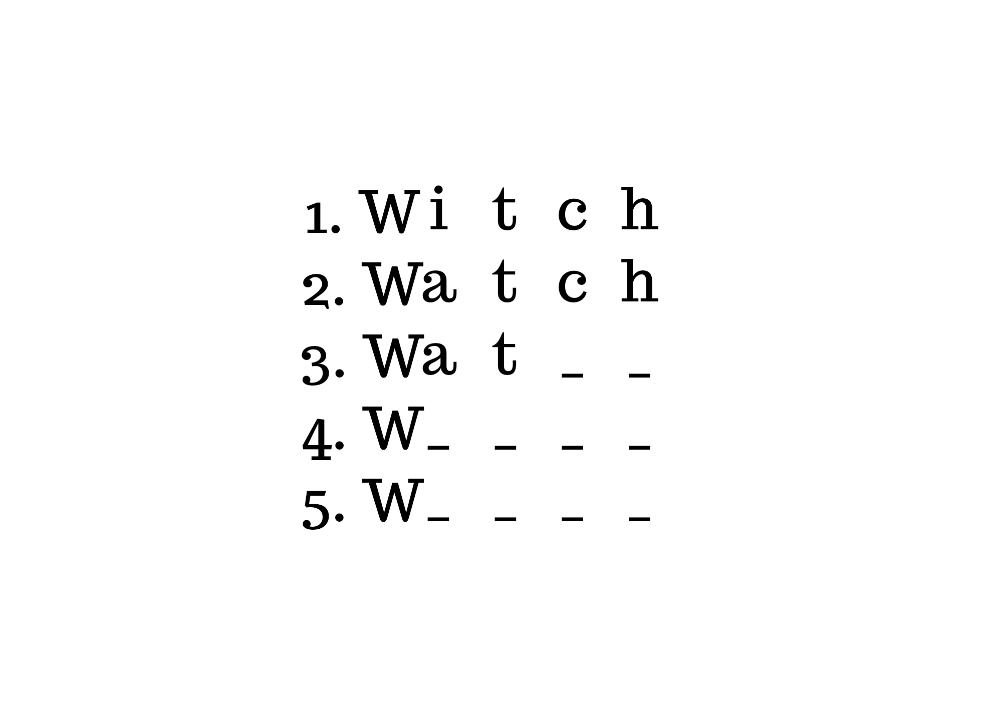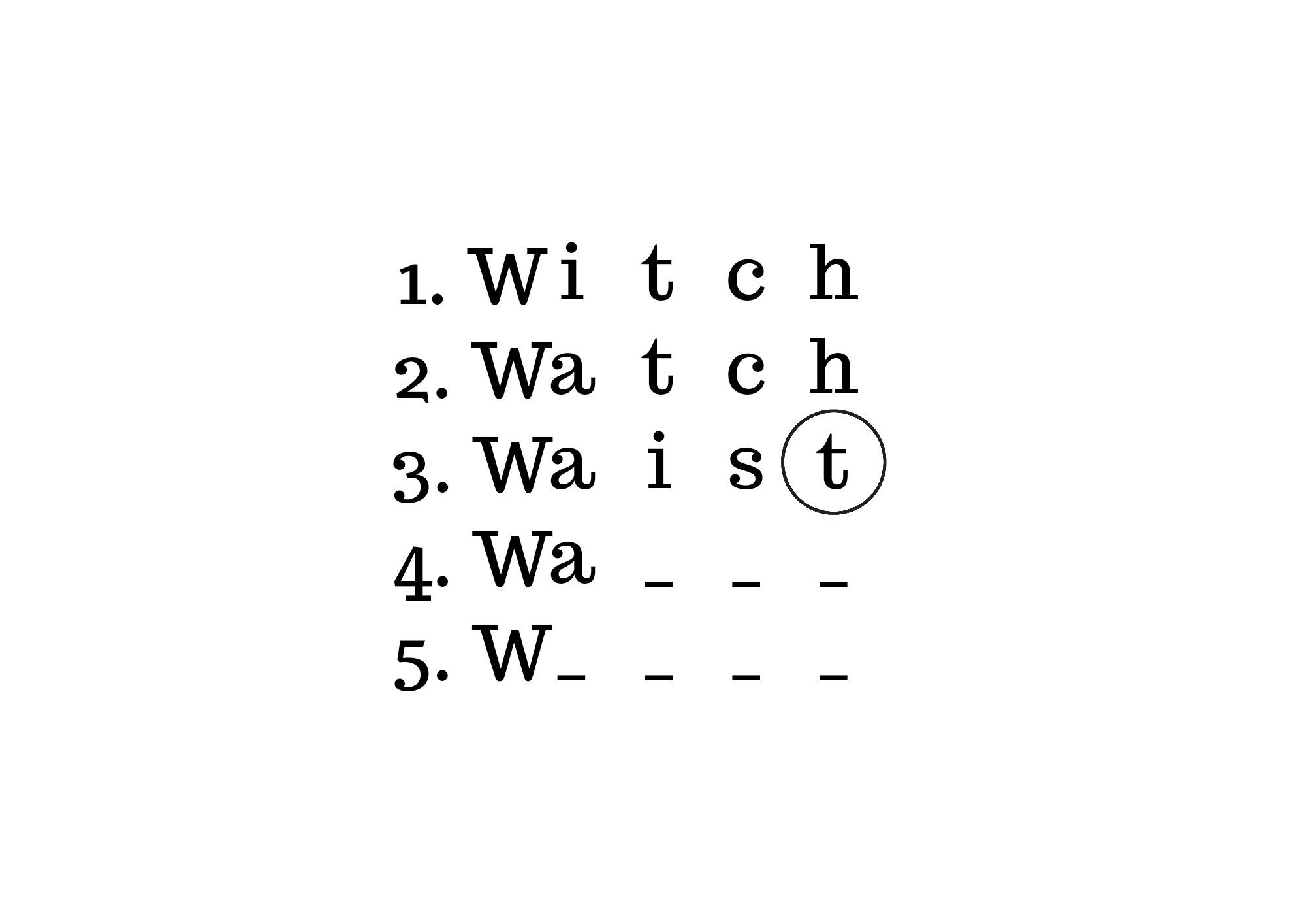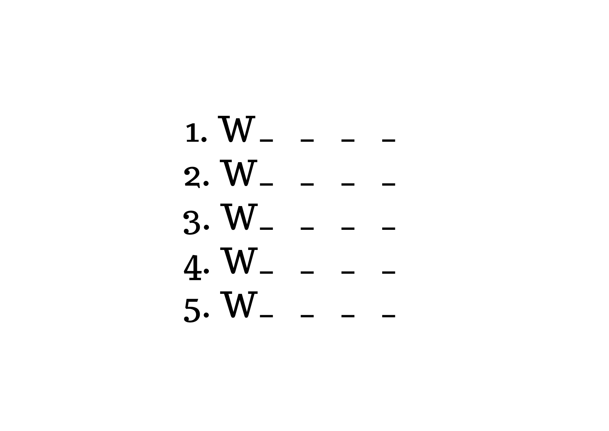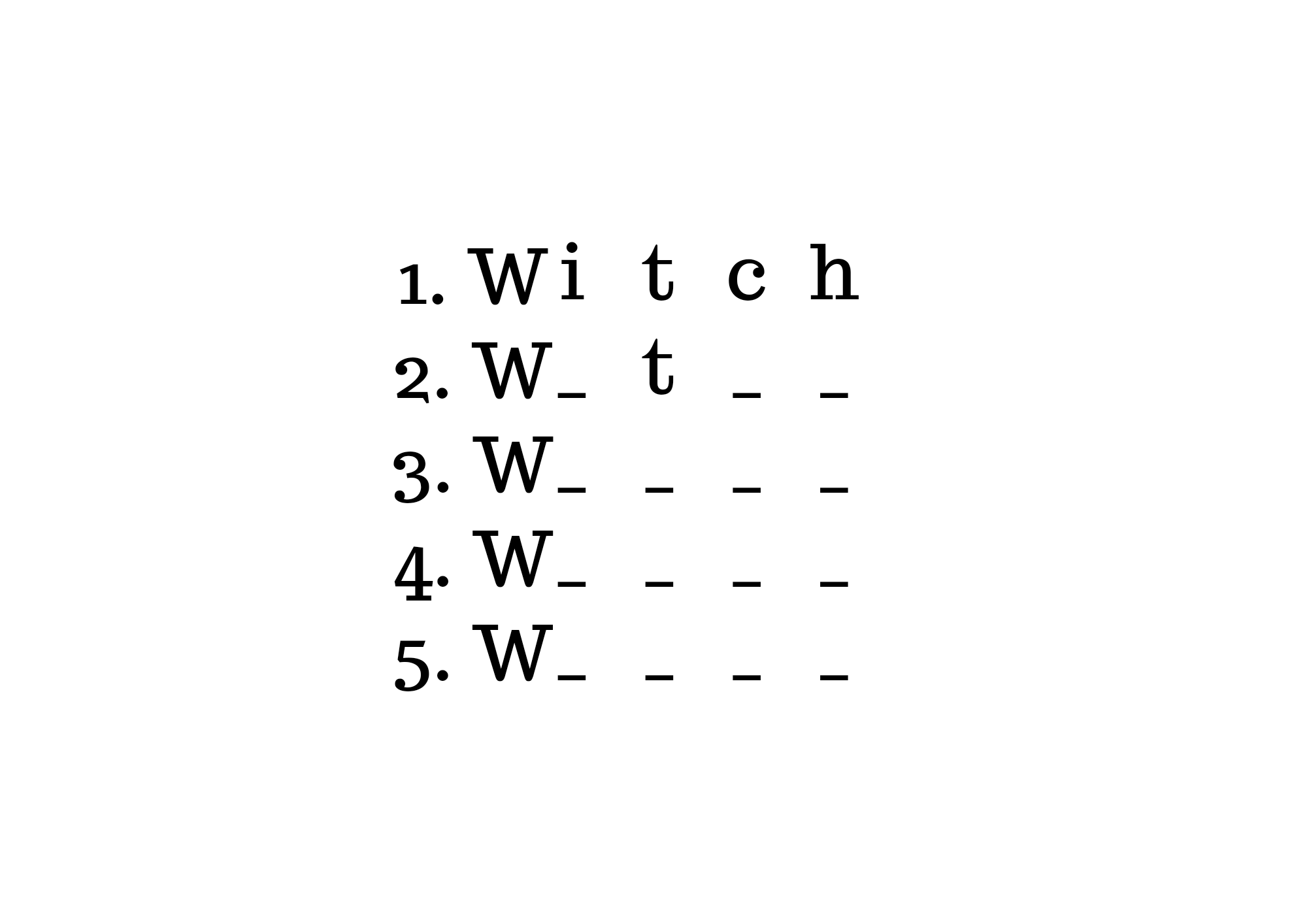 - jeśli w zaproponowanym haśle znajduje się literka, która w tym samym miejscu znajduje się w haśle poszukiwanym, osoba prowadząca przepisuje ją;
